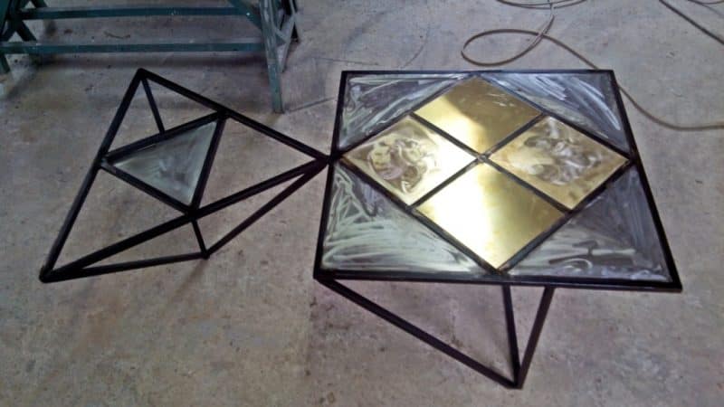 Per questo tipo di tavolino ho scelto di riempire i perimetri creati da quadrelli pieni di ferro con acciaio e ottone, che mi rende un contrasto tra il moderno ed il classico. Tutto questo per dare un impatto visivo con gli effetti di luce che il metallo ci offre riflettendo le varie sfumature cromatiche.